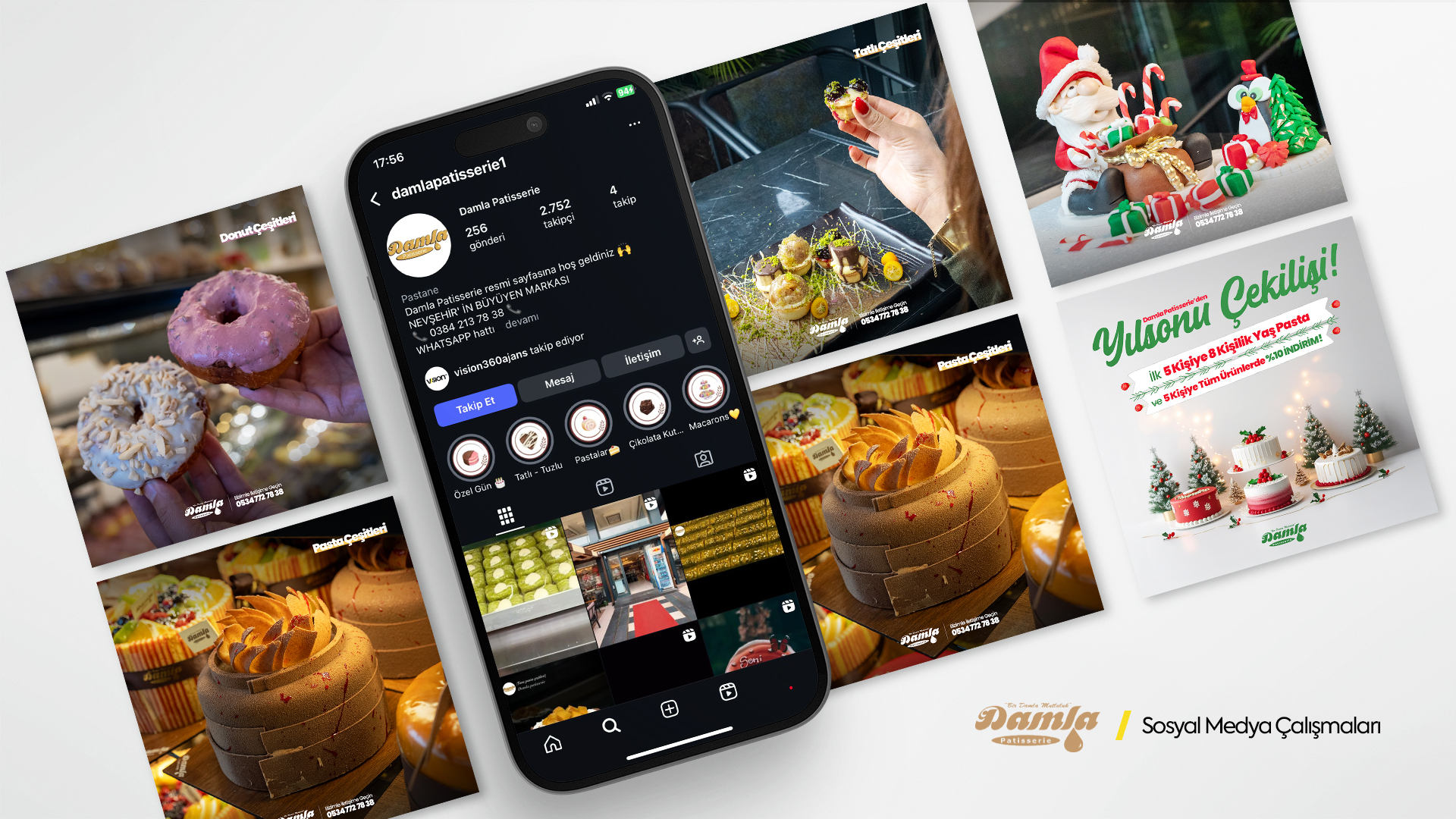 Vision360 Ajans olarak, Damla Pastanesi’nin dijital dünyadaki etkisini artırmak için sosyal medya yönetimi, prodüksiyon, grafik tasarım ve marka danışmanlığı hizmetleri sunduk. Yaratıcı ve stratejik yaklaşımlarımızla Damla Pastanesi’nin marka kimliğini güçlendirdik, sosyal medyada etkili bir görünürlük sağladık ve lezzetlerini geniş kitlelerle buluşturmasını destekledik. Damla Pastanesi’nin tatlıdan tuzluya uzanan lezzetlerini, güçlü bir dijital varlıkla taçlandırdık.